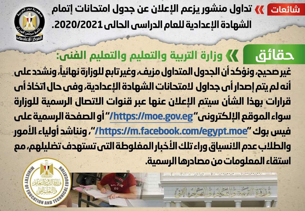 وتواصل المركز الإعلامي لمجلس الوزراء مع وزارة التربية والتعليم والتعليم الفني، والتي نفت تلك الأنباء، مُؤكدةً أنه لا صحة للمنشور المتداول الذي يزعم الإعلان عن جدول امتحانات إتمام الشهادة الإعدادية للعام الدراسي الحالي 2020/ 2021، وأن الجدول المتداول مزيف، وغير تابع للوزارة نهائياً.
