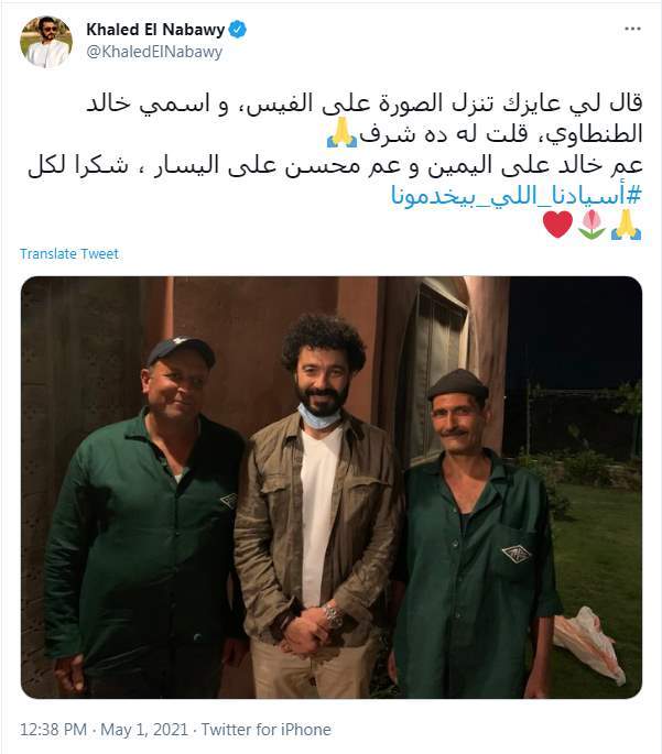 وظهر خالد النبوي في الصورة رفقة عمال نظافة معلقا عليها قائلا: "قال لي عايزك تنزل الصورة على الفيس، واسمي خالد الطنطاوي، قلت له ده شرف... عم خالد على اليمين وعم محسن على اليسار، شكرا لكل #أسيادنا_اللي_بيخدمونا".