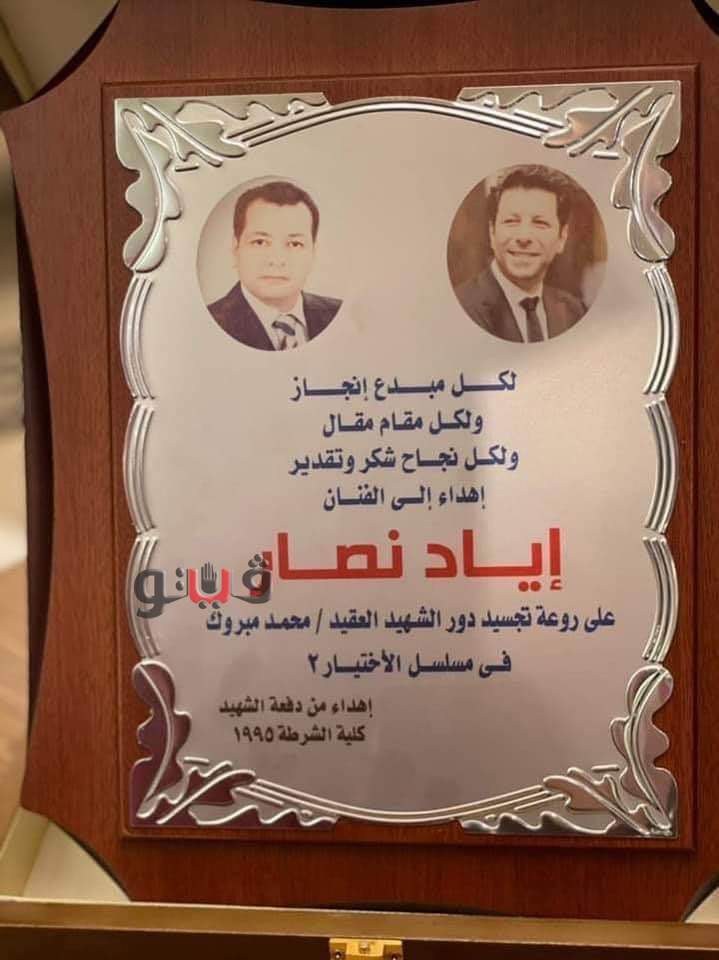 " لكل مبدع إنجاز ولكل مقال مقال ولكل نجاح شكر وتقدير واهداء الى الفنان إياد نصار على روعة تجسيد دور الشهيد العقيد محمد مبروك فى مسلسل الاختيار2 .. اهداء من دفعة الشهيد كلية الشرطة 1995.