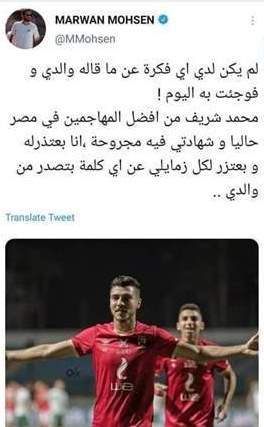ونشر مروان محسن صورة لمحمد شريف عبر حسابه الشخصي على موقع التواصل الاجتماعي تويتر قائلا" لم يكن لدى أى فكرة عن ما قاله والدي وفوجئت به اليوم!