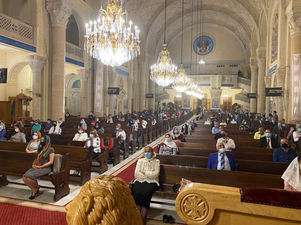 وتوافد أقباط الكنيسة للمشاركة في حضور القداس بداخل الكنيسة وذلك في نطاق العدد المسموح للحضور بنسبة 25% لتفادي انتشار فيروس كورونا المستجد وانتقال العدوى بين شعب الكنيسة وفقا لقرار البابا تواضروس الثاني بابا الإسكندرية بطريرك الكرازة المرقسية.