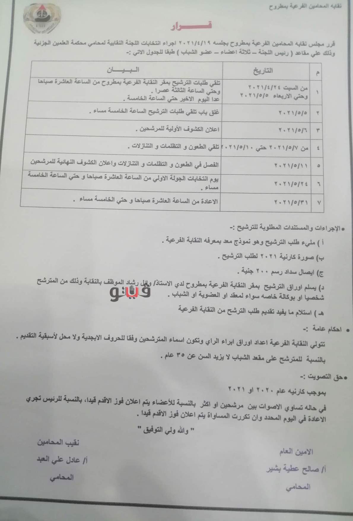 الجدول الزمني لانتخابات اللجنة النقابية لمحامي مرسى مطروح