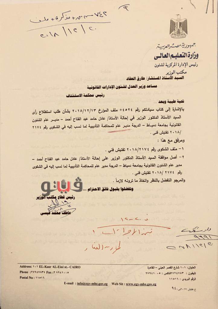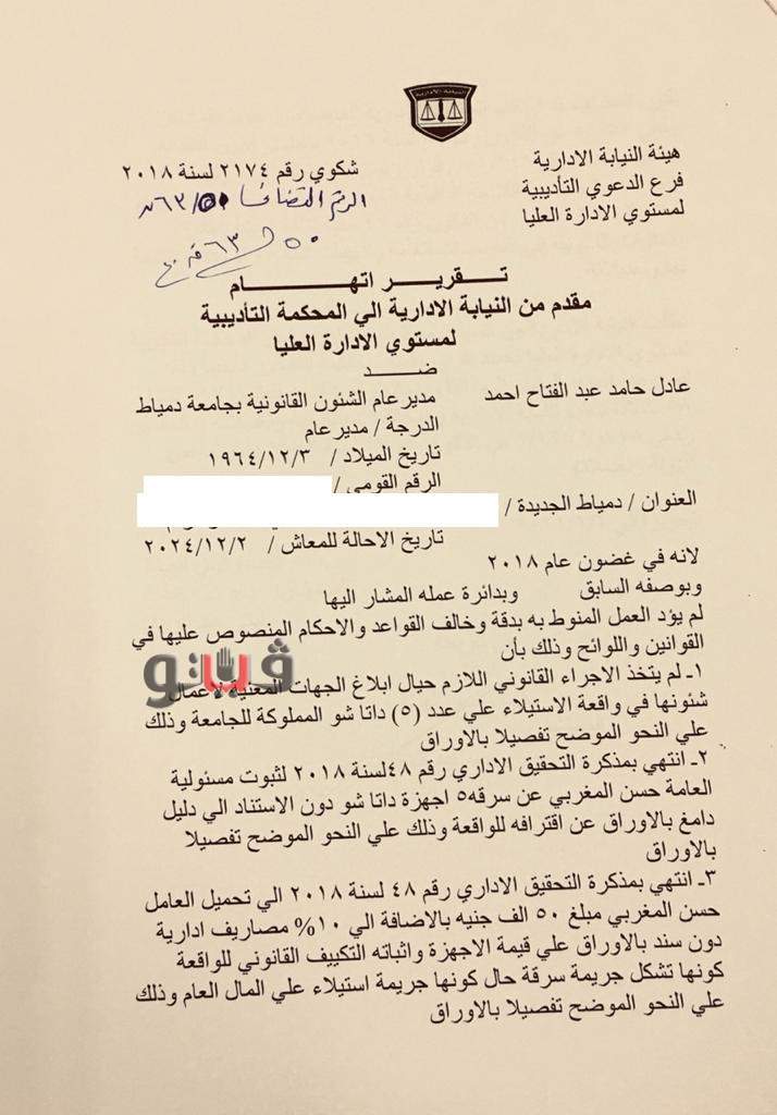 إحالة مدير عام الشئون القانونية بجامعة دمياط للمحاكمة التأديبية