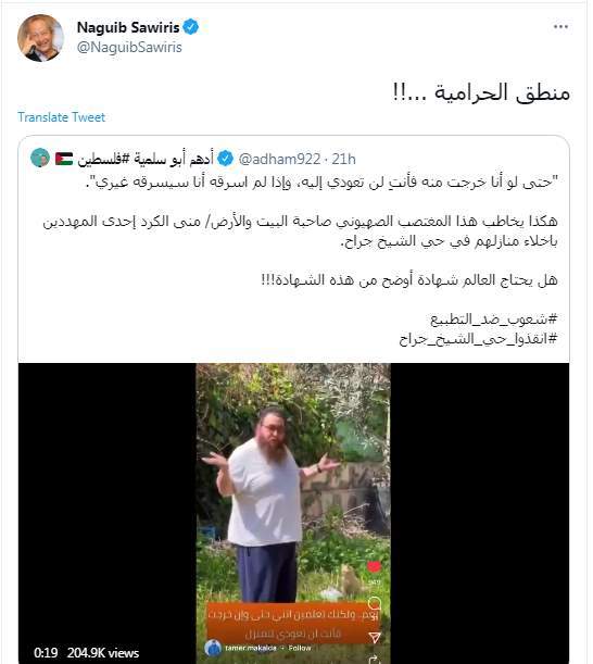 وجاء ذلك ردًا على تغريدة وفيديو لأحد متابعيه عن فيديو اغتصاب مستوطن لأرض فلسطينية يقول: "حتى لو أنا خرجت منه فأنتِ لن تعودي إليه، وإذا لم اسرقه أنا سيسرقه غيري". هكذا يخاطب هذا المغتصب الصهيوني صاحبة البيت والأرض/ منى الكرد إحدى المهددات بإخلاء منازلهم في حي الشيخ جراح. هل يحتاج العالم شهادة أوضح من هذه الشهادة! #شعوب_ضد_التطبيع #انقذوا_حي_الشيخ_جراح"