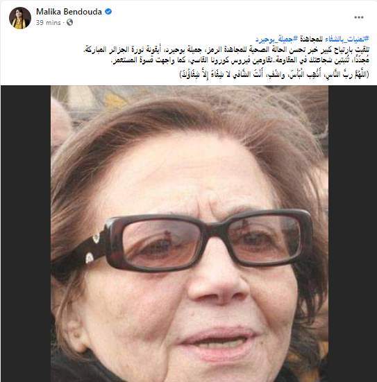 وكتبت مليكة بن دودة عبر الفيس بوك "تلقيت بارتياح كبير خبر تحسن الحالة الصحية للمجاهدة الرمز، جميلة بوحيرد، أيقونة ثورة الجزائر المباركة"