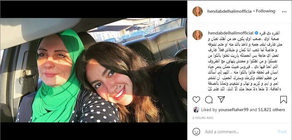 وكتبت الفنانة هند عبد الحليم قائلة: "الفترة دي فترة صعبة أوي.. صعب أوي يكون حد من أهلك تعبان ومش عارف تبقى جمبه وتاخد بالك منه أو حتى تشوفه خاصة لما تتعب أنت كمان ومتبقاش فعلاُ عارف تعمل أي حاجة بس الحمد لله ياريت تخلوا بالكوا من نفسكوا ومن أهلكوا و محدش يتهاون مع الظروف اللي إحنا فيها دي".