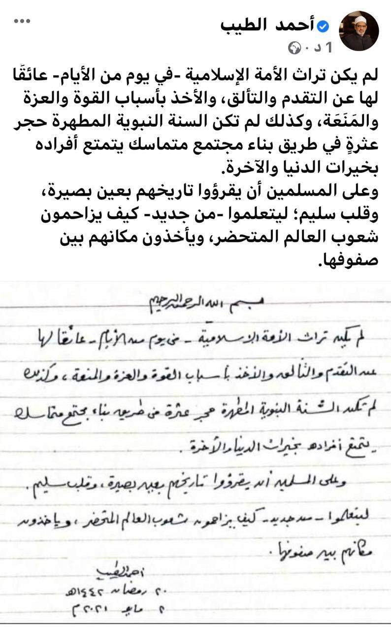شيخ الأزهر وجاءت تغريدة شيخ الأزهر ردا على الانتقات التى وجهت له مؤخرا لتغير موقفة من قضية التراث، وتأثرها لدعوات خارجية تصادف خروجها بالتزامن مع إذاعة حلقات برنامج شيخ الأزهر الرمضاني والتي تحدث خلالها عن قضية التجديد.