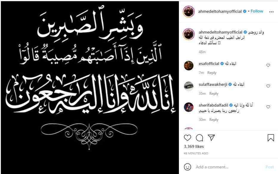 وكتب أحمد التهامي قائلا: "والد زوجتي، الراجل الطيب المحترم في ذمة الله.. نسألكم الدعاء".
