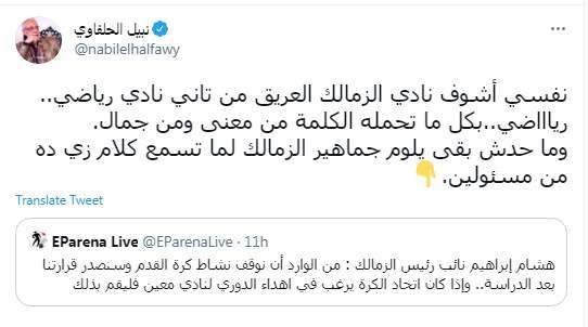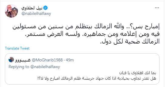 وكتب نبيل الحلفاوي تغريدة على تويتر "نفسي أشوف نادي الزمالك العريق من تاني نادي رياضي.. رياااضي..بكل ما تحمله الكلمة من معنى ومن جمال. وما حدش بقى يلوم جماهير الزمالك لما تسمع كلام زي ده من مسئولين"