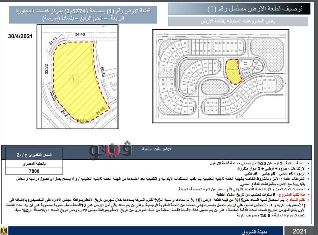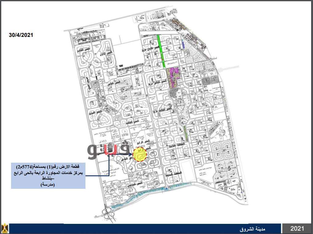 تطرح وزارة الاسكان ممثلة فى هيئة المجتمعات العمرانية عدد من قطع الاراضى الاستثمارية بأنشطة تعليمية بمدينة الشروق، وتضم أرضا بمساحة 5774 مترا بنشاط مدرسة بسعر 7800