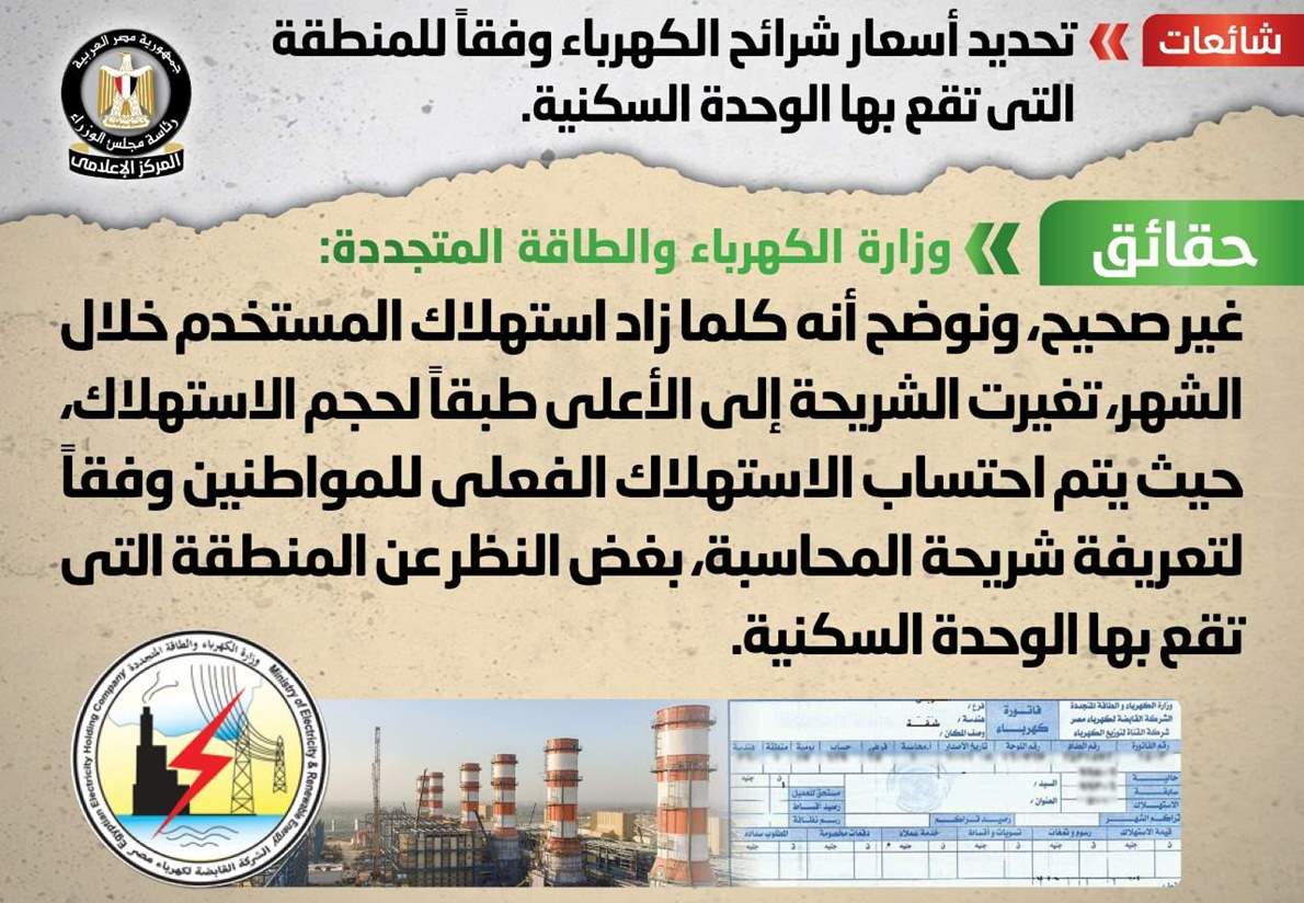وقام المركز الإعلامي لمجلس الوزراء بالتواصل مع وزارة الكهرباء والطاقة المتجددة، والتي نفت تلك الأنباء، مُؤكدةً أنه لا صحة لتحديد أسعار شرائح الكهرباء وفقاً للمنطقة التي تقع بها الوحدة السكنية، موضحةً أنه كلما زاد استهلاك المستخدم خلال الشهر، تغيرت الشريحة إلى الأعلى طبقاً لحجم الاستهلاك، حيث يتم احتساب الاستهلاك الفعلي للمواطنين وفقاً لتعريفة شريحة المحاسبة بغض النظر عن المنطقة التي تقع بها الوحدة السكنية.