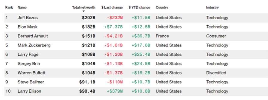 وبحجب مركزه من القائمة، دون سبب معلن، لم يتغير ترتيب الأثرياء على مؤشر بلومبرج للمليارديرات فظل مارك زوكربيرج مؤسس فيسبوك في المركز الخامس، وتلاه لاري بيج وسيرجي برين ووارن بافيت في المراكز التالية.