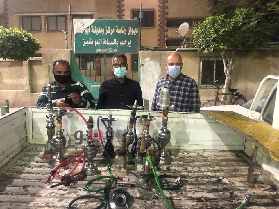تم مصادرة ثلاث عشرة شيشة وجدت يتم تقديمها بطريقة مخالفة بالعديد من الكافيهات والمقاهي حال مرور الحملة بالمدينة وبنطاق الوحدات المحلية بالمركز.