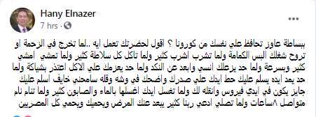وكتب هاني الناظر تدوينة على الفيس بوك "ببساطة عاوز تحافظ علي نفسك من كورونا ؟ اقول لحضرتك تعمل ايه.. لما تخرج في الزحمة او تروح شغلك البس الكمامة ولما تشرب اشرب كثير ولما تاكل كل سلاطة كثير ولما تمشي امشي كثير وبسرعة "