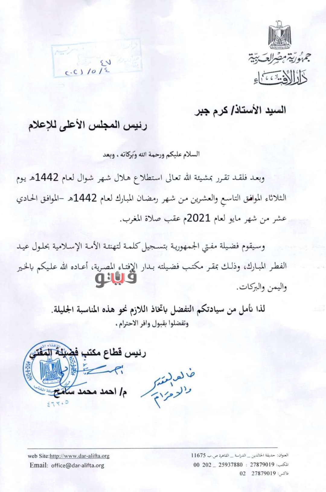 أرسلت دار الإفتاء المصرية؛ خطابا إلى المجلس الأعلى لتنظيم الإعلام برئاسة الكاتب الصحفي كرم جبر؛ حول استطلاع هلال شهر شوال.