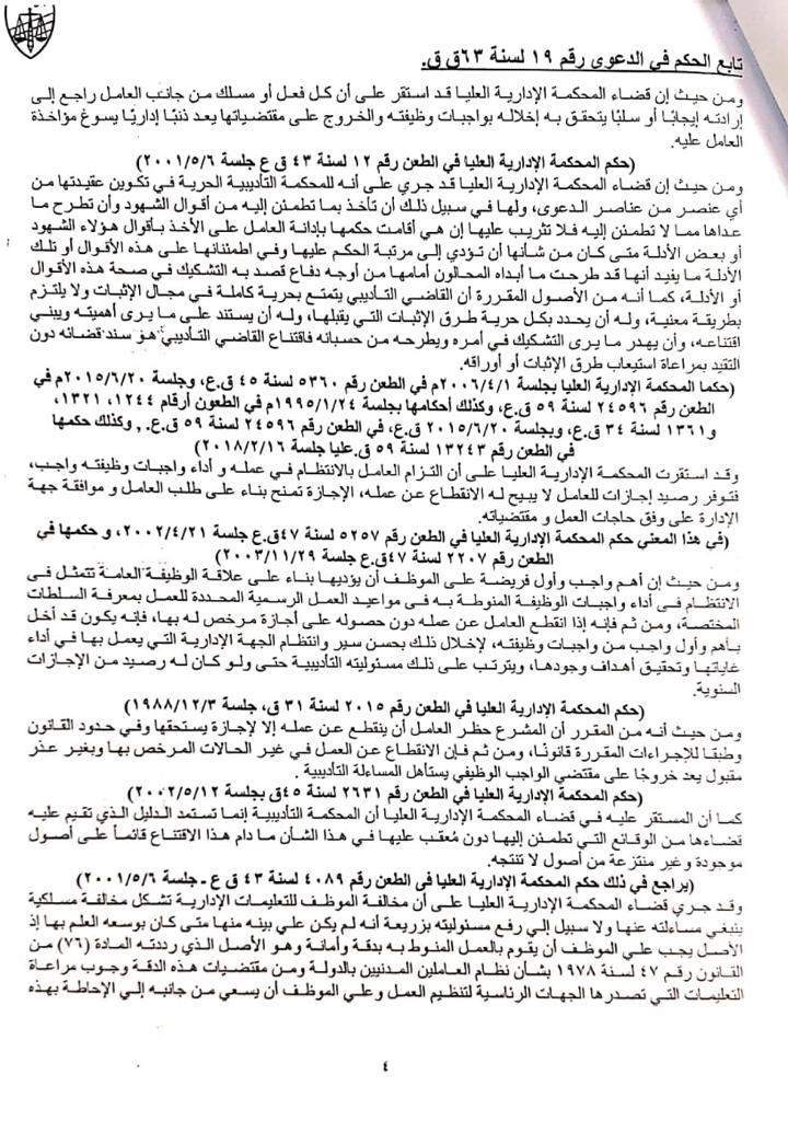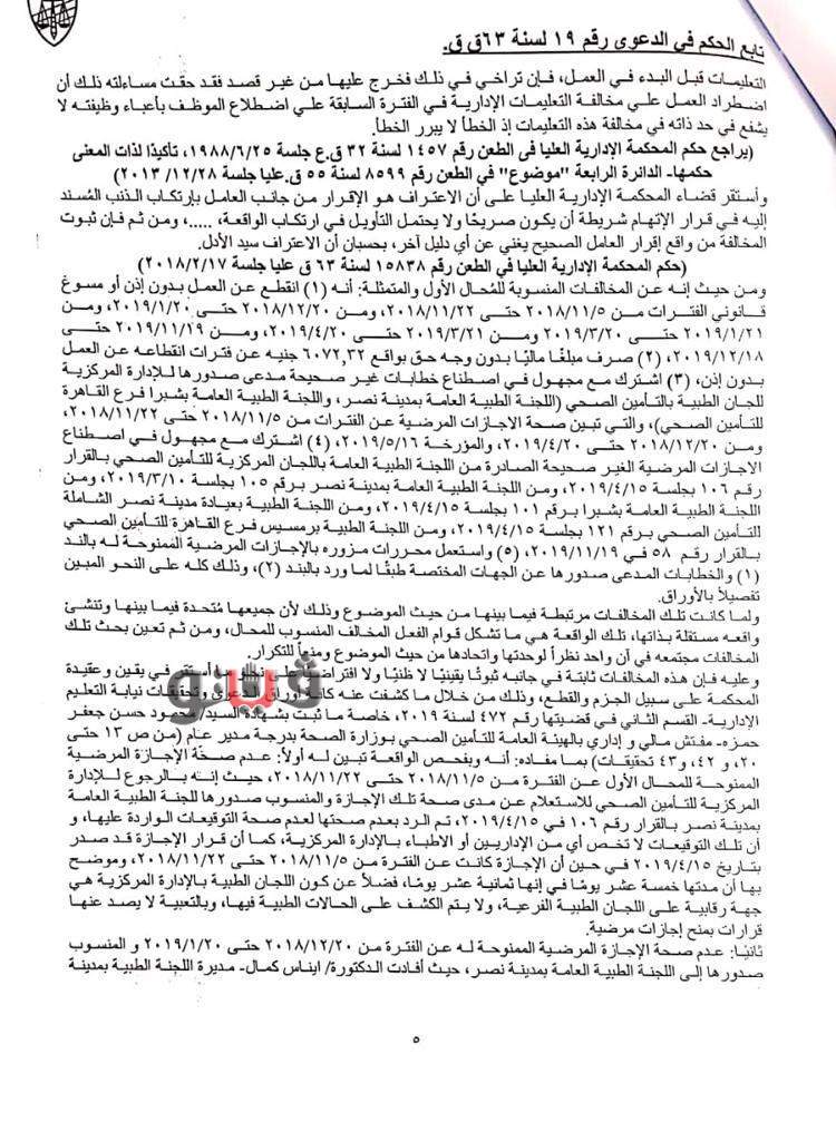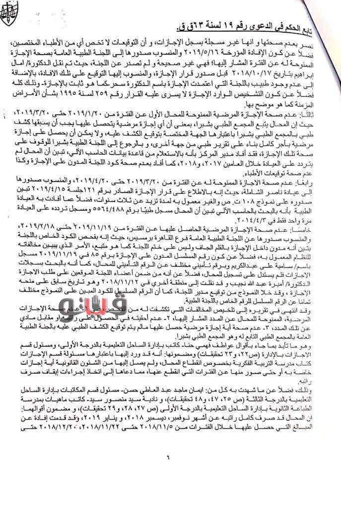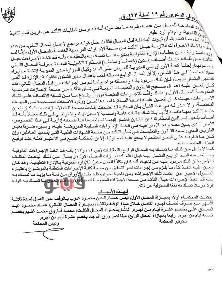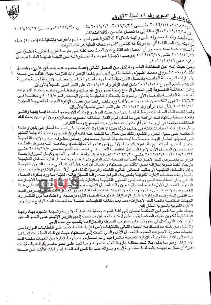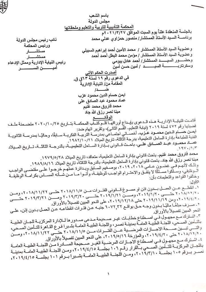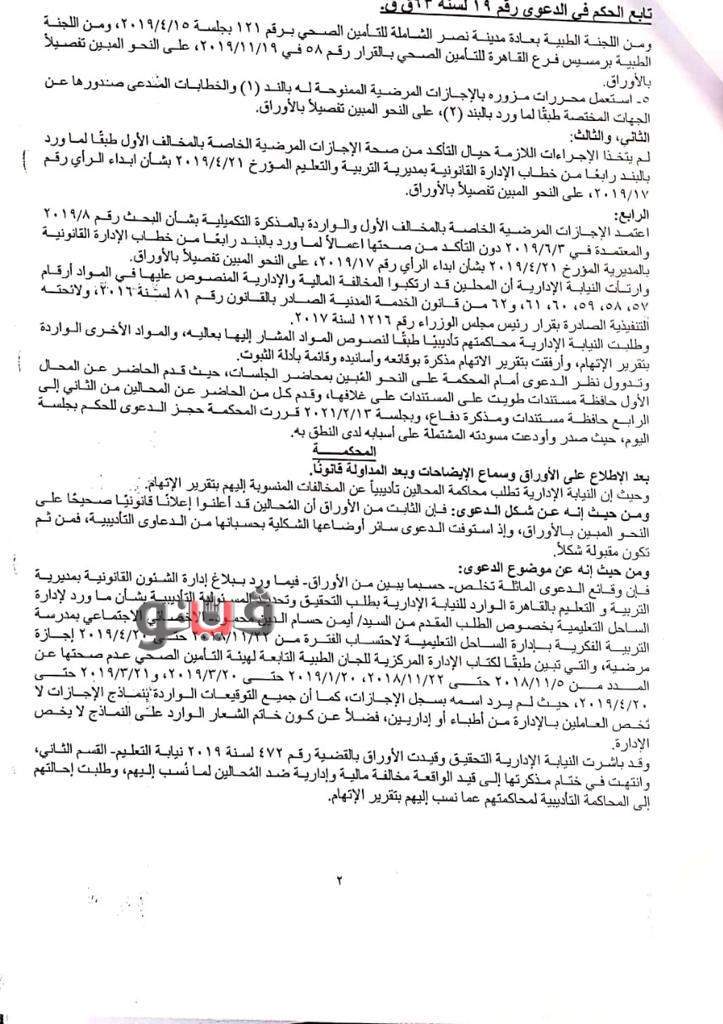 وأكدت المحكمة عبر أوراق القضية أن عماد محمود عبدالصادق علي، باحث قانوني ثالث بادارة الساحل التعليمية ومحمد فاروق محمد غنيم، باحث قانوني متعاقد لم يتخذا الإجراءات اللازمة حيال التأكد من صحة الإجازات المرضية الخاصة بالمتهم الأول طبقا لما ورد بالبند رابعًا من خطاب الإدارة القانونية بمديرية التربية والتعليم بشأن إبداء الرأي رقم ١٧ لسنة ٢٠١٩، وقضت المحكمة بمجازاة المحال الثاني عماد محمود عبد الصادق، بخصم أجر عشرة أيام من راتبه ومجازاة المحال الثالث محمد فاروق غنيم بخصم أجر خمسة أيام من راتبه.
