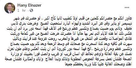 وكتب هاني الناظر تدوينة على الفيس بوك "عاوز اتكلم مع حضراتكم كلمتين من قلبي أولا كطبيب ثانيًا كأخ أكبر.. لو حضرتك في شهر ديسيمبر أو يناير وفي عز البرد الشديد والهواء البارد استحميت الصبح وخرجت بدري لابس خفيف وتاني يوم حسيت بصداع وتكسير عظم ورشح في الأنف فهذا اسمه دور برد إلي ان يثبت عكس ذلك"