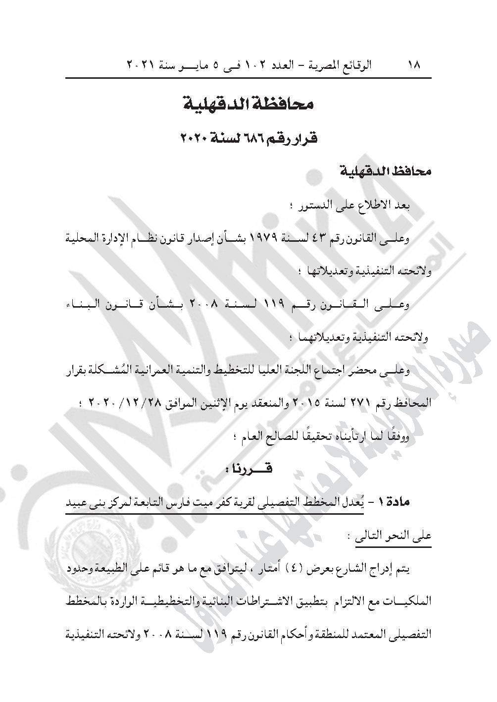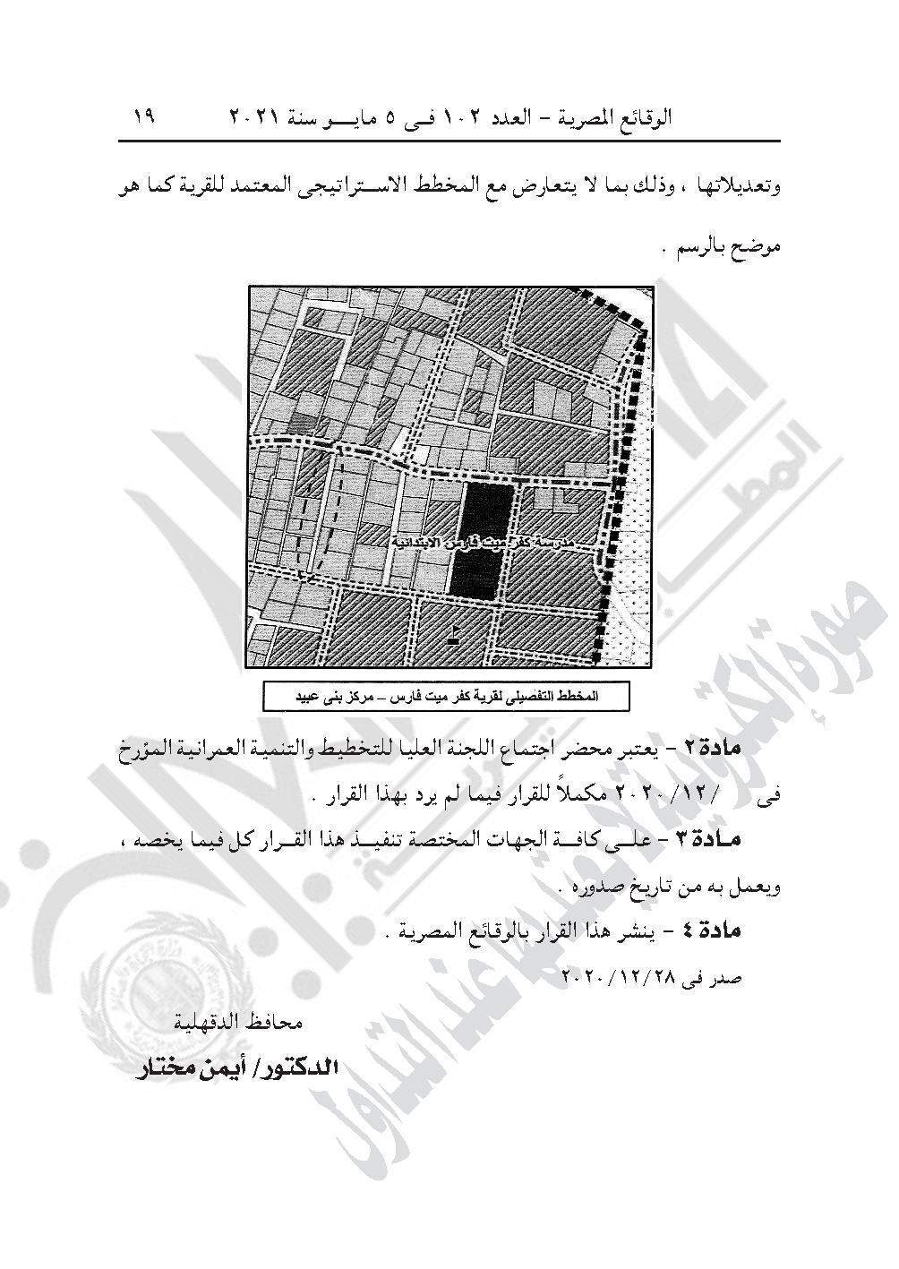 نشرت جريدة الوقائع المصرية في عددها رقم 102، الصادر في 5 مايو 2021، قرار محافظة الدقهلية رقم 686 لسنة 2020، بشأن تعديل المخطط التفصيلي لقرية كفر ميت فارس، التابعة لمركز بني عبيد.