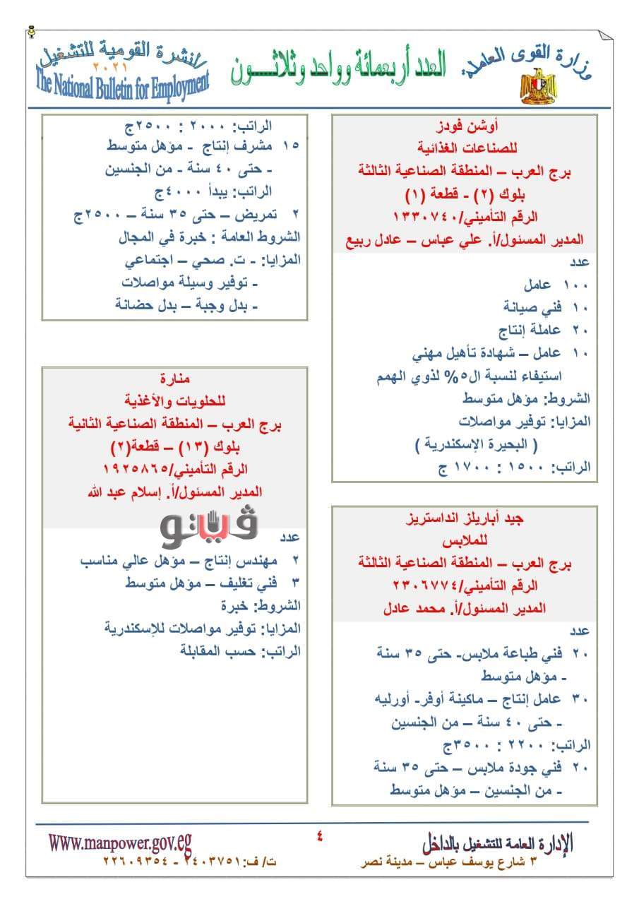 كما تم توفير فرص عمل بالإسكندرية ، تمثلت في اخصائي مشتريات خارجية براتب يصل لـ 6000 جنيه ، ومدير مخازن براتب يصل لـ 8000 جنيه ، و 25 عامل إنتاج ، و 110 عامل عادي ، و 10 فنى صيانة ، و 50 عاملة إنتاج ، و 30 فنى طباعة ملابس ، و 15 مشرف انتاج ، و 2 تمريض ، و4 مهندسين انتاج ، ومهندس تخطيط ، ومهندس برمجيات براتب يصل لـ 10 آلاف جنيه وخبرة لا تقل عن 5 سنوات إلى 10 سنوات ، و 3 فنى تغليف ، ومصمم جرافيك ، و 100 عامل خياطة ، و 30 مراقب جودة ، و 5 عمال مقص ، و 30 عامل تعبئة ، و 30 متدرب لمدة شهر براتب 1200 جنيه مع توفير مواصلات ، و 2 فرد أمن ، و 2 فنى ثيرمو فورم ، و3 عمال نظافة ، و 3 فنى طباعة أوفست و 2 مساعد .
