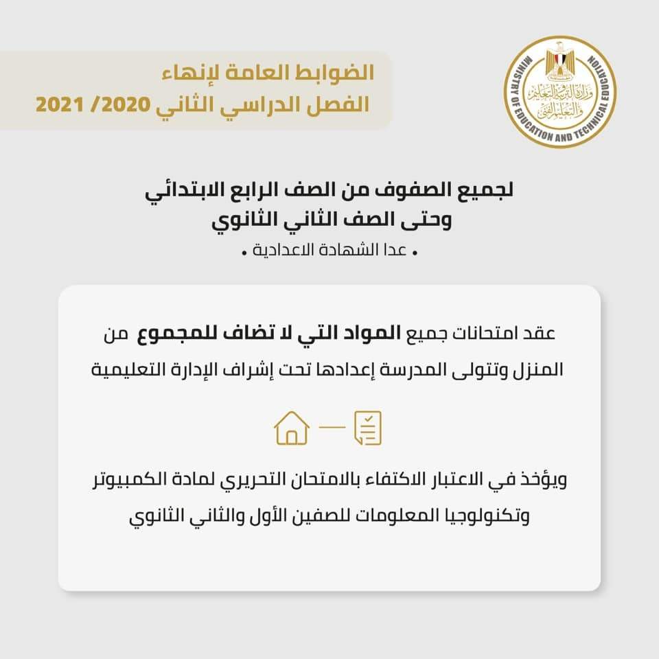 أعلنت وزارة التربية والتعليم والتعليم الفني عن الضوابط العامة لإنهاء الفصل الدراسي الثاني ٢٠٢٠/ ٢٠٢١ لجميع صفوف النقل بالتعليم الأساسي والثانوي العام ولجميع فئات التعليم العام، في إطار الحرص على مصلحة أبنائنا الطلاب: