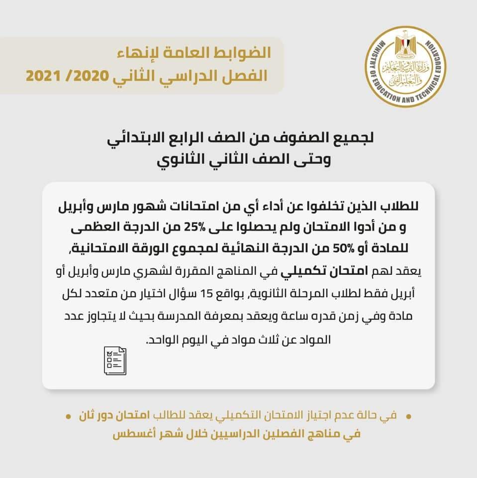 للطلاب الذين تخلفوا عن أداء أي من امتحانات شهور مارس وأبريل (بالنسبة للطلاب من الرابع الابتدائي وحتى الثاني الإعدادي) أو من تخلف عن امتحان شهر أبريل (بالنسبة للمرحلة الثانوية) ومن أدوا الامتحان ولم يحصلوا على ٢٥٪ من الدرجة العظمى للمادة أو ٥٠٪ من الدرجة النهائية لمجموع الورقة الامتحانية، يعقد لهم امتحان تكميلي في المناهج المقررة لشهري مارس وأبريل أو أبريل فقط لطلاب المرحلة الثانوية، بواقع ١٥ سؤال اختيار من متعدد لكل مادة وفي زمن قدره ساعة ويعقد بمعرفة المدرسة بحيث لا يتجاوز عدد المواد عن ثلاث مواد في اليوم الواحد.