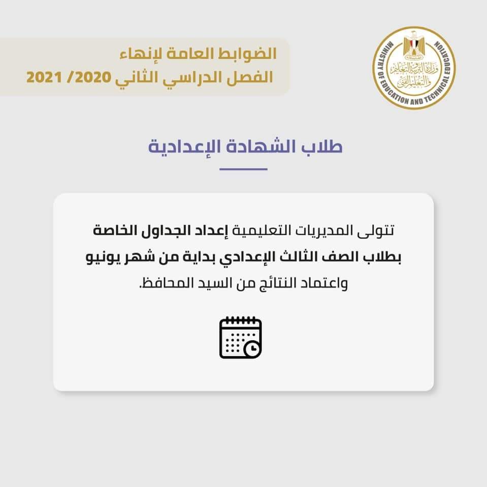 تتولى المديريات التعليمية إعداد الجداول الخاصة بطلاب الصف الثالث الإعدادي بداية من شهر يونيو واعتماد النتائج من السيد المحافظ.