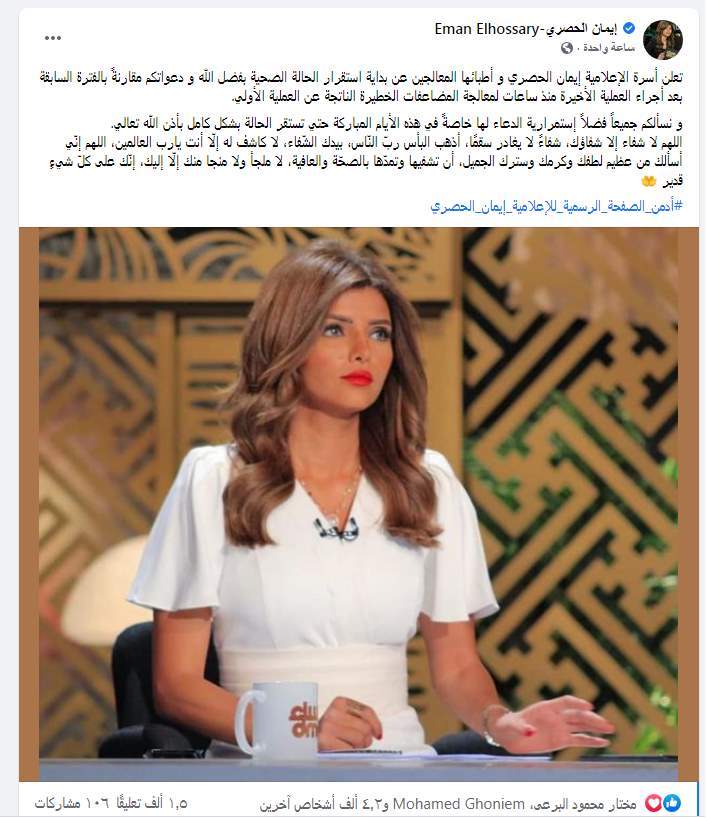 وكتبت الصفحة الرسمية لـ إيمان الحصري عبر فيس بوك: "نسألكم الدعاء بالشفاء العاجل للإعلامية القديرة إيمان الحصري.. أجرت الزميلة إيمان الحصري عملية جراحية منذ أسبوعين الأمر الذي ترتب بعده حدوث مضاعفات مؤسفة نتج عنه ضرورة المكوث بالمستشفى والخضوع لعدة عمليات جراحية أخرى في محاولة طبية مضنية لتلافي الأضرار الناتجة عن العملية الأولى كان آخرها عملية بالأمس علي أمل استقرار الحالة أو لا قدر الله إجراء عملية أخرى، نطالب من حضراتكم في هذه الأيام المفترجة الدعاء للزميلة العزيزة بالشفاء العاجل".