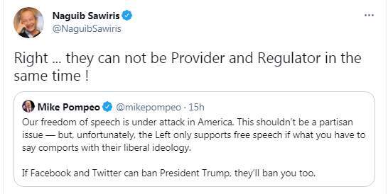 جاء ذلك تعليقًا على تغريدة لمايك بومبيو قال فيها: "تتعرض حريتنا في التعبير للهجوم في أمريكا. لا ينبغي أن تكون هذه قضية حزبية - ولكن، لسوء الحظ ، يدعم اليسار حرية التعبير فقط إذا كان ما تريد قوله يتوافق مع أيديولوجيتهم الليبرالية.. إذا كان بإمكان Facebook وTwitter حظر الرئيس ترامب، فسيتم حظرك أيضًا".