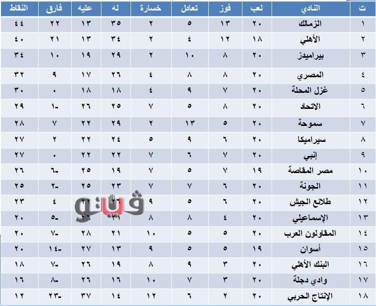 تنشر بواية فيتو جدول ترتيب الدوري الممتاز بعد نهاية مباريات الجولة الـ 20 وفوز الزمالك والأهلي وبيراميدز وغزل المحلة.