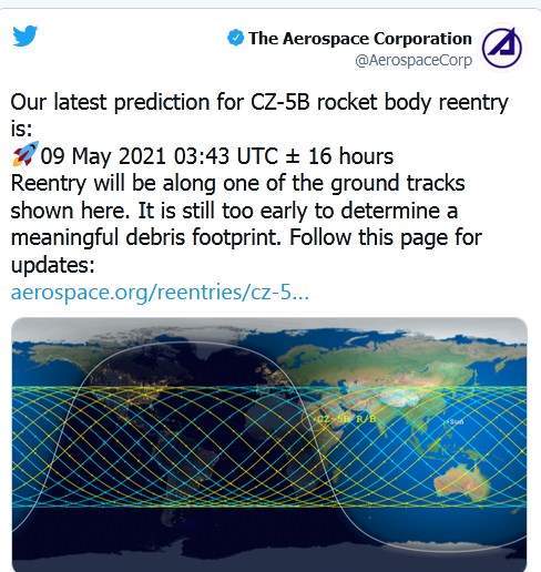ونقل تقرير لصحيفة "نيويورك تايمز" الأميركية عن المنظمة غير الربحية التي تمولها الحكومة الأميركية، أن الصاروخ قد يدخل المجال الجوي للأرض السبت.