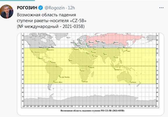 ومن جهة أخرى، غرد دميتري روجوزين رئيس وكالة الفضاء الروسية (روسكوزموس)، الخميس، بنشر خريطة للأرض تظهر مناطق الاصطدام المحتملة للصاروخ.