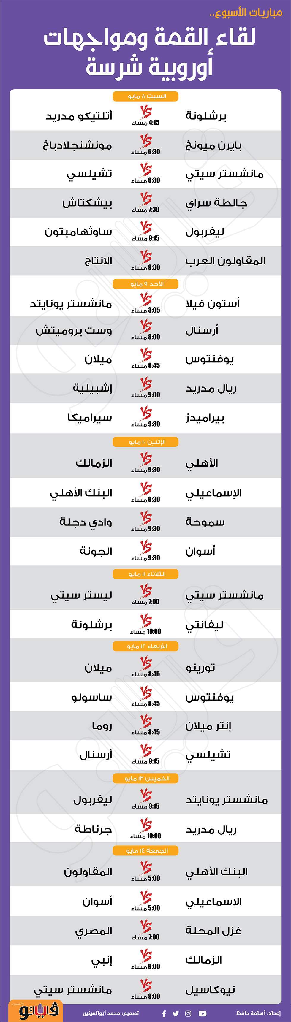 مباريات الأسبوع.. لقاء القمة ومواجهات أوروبية شرسة| إنفوجراف الجمعة 07/مايو/2021 - 08:29 م 5/7/2021 8:29:17 PM الأهلي والزمالك أسامة حافظ شارك طباعة 18 حجم الخط شارك طباعة لقاء القمة الأهلى والزمالك مباريات الاسبوع