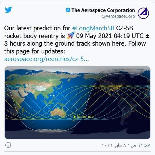 وأوضحت "أيروسبيس كوربوريشن" في تغريدتها: "آخر توقعاتنا لعودة جسم الصاروخ 09 مايو 2021 04:19 بالتوقيت العالمي المنسق ± 8 ساعات على طول المسار الأرضي الموضح هنا"، مع إدراج خريطة في التغريدة.
