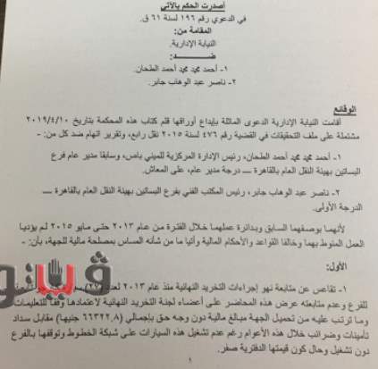 أصدرت المحكمة التأديبية العليا بمجلس الدولة حكمها في القضية رقم 196 لسنة 61 قضائية عليا ببراءة رئيس الإدارة المركزية للميني باص بهيئة النقل العام بالقاهرة ورئيس المكتب الفني بفرع البساتين بعد ثبوت اعتراض إحدى الجهات الرقابية على عملية تخريد سيارات الـ"ميني باص" وعدم إرتكابهما مخالفات مالية وإدارية جسيمة.