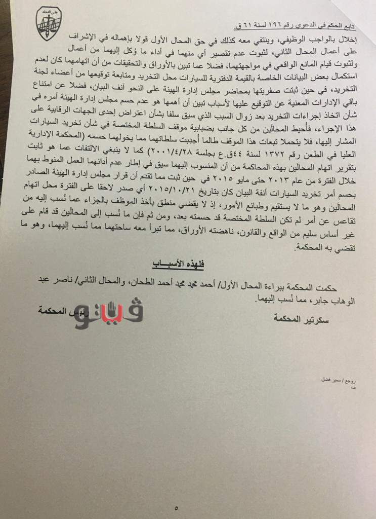 واشارت المحكمة الى انه لا ينبغي الالتفات عما هو ثابت بتقرير اتهام المحالَين من أن المنسوب إليهما سيق في إطار عدم أدائهما العمل المنوط بهما في حين ثبت مما تقدم أن قرار مجلس إدارة الهيئة الصادر بحسم أمر تخريد السيارات آنفة البيان صدر لاحقا على الفترة محل اتهام المحالَين وهو ما لا يستقيم وطبائع الأمور، إذ لا يقضي منطق بأخذ الموظف بالجزاء عما نُسب إليه من تقاعس عن أمر لم تكن السلطة المختصة قد حسمته بعد، ومن ثم فإن ما نُسب إلى المحالَين قد قام على غير أساس سليم من الواقع والقانون، ناهضته الأوراق، مما تبرأ معه ساحتهما مما نُسب إليهما، وهو ما تقضي به المحكمة، فأصدرت المحكمة حكمها ببراءة المحال الأول أحمد محمد الطحان، والمحال الثاني ناصر عبد الوهاب جابر، مما نُسب إليهما.