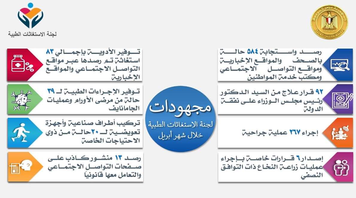وأضاف المستشار الطبي أن لجنة الاستغاثات الطبية تمكنت كذلك خلال شهر أبريل الماضي من إصدار 6 قرارات خاصة بإجراء عمليات لزراعة النخاع ذات التوافق النصفي، وتركيب أطراف صناعية وأجهزة تعويضية لـ 20 حالة من ذوي الاحتياجات الخاصة، كما تم توفير الإجراءات الطبية لـ 39 حالة من مرضى الأورام وعمليات الجامانايف، مع توفير الأدوية بإجمالي 83 استغاثة تم رصدها، وتم كذلك رصد 13 منشوراً كاذباً على صفحات التواصل الإجتماعي والتعامل معها قانونياً.