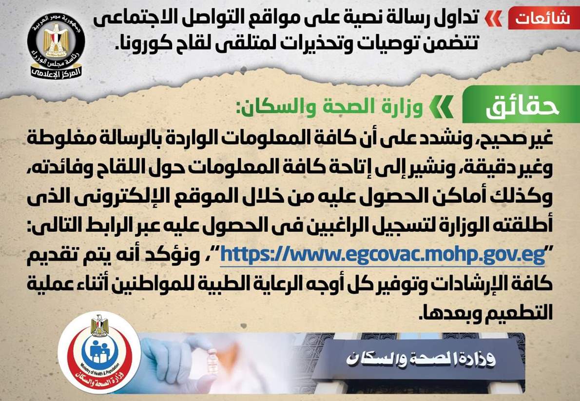 وقام المركز الإعلامي لمجلس الوزراء بالتواصل مع وزارة الصحة والسكان، والتي نفت تلك الأنباء، مُؤكدةً أنه لا صحة للرسالة النصية المتداولة على مواقع التواصل الاجتماعي والتي تتضمن توصيات وتحذيرات لمتلقي لقاح كورونا، مُشددةً على أن كافة المعلومات الواردة بالرسالة مغلوطة وغير دقيقة، مشيرةً إلى إتاحة كافة المعلومات حول اللقاح وفائدته، وكذلك أماكن الحصول عليه من خلال الموقع الإلكتروني الذي أطلقته الوزارة لتسجيل الراغبين في الحصول عليه عبر الرابط هنا ، مؤكدةً أنه يتم تقديم كافة الإرشادات وتوفير كل أوجه الرعاية الطبية للمواطنين أثناء عملية التطعيم وبعدها.