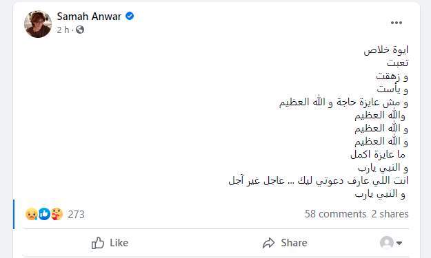 وكتبت سماح في منشور عبر حسابها الرسمي بموقع التواصل الاجتماعي “فيس بوك”، منشور قالت فيه: “أيوة خلاص تعبت وزهقت ويأست.. ومش عايزة حاجة والله العظيم.. والله العظيم.. والله العظيم.. والله العظيم.. ما عايزة أكمل.. والنبي يارب.. أنت اللي عارف دعوتي ليك.. عاجل غير آجل.. والنبي يارب”.