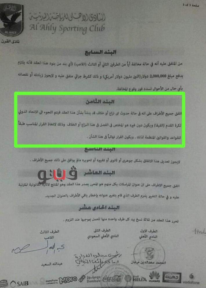 وأكد أن تلك هي اللوائح العالمية لكرة القدم، كما أن العقد نص صراحة في بنده الثامن على "اتفق جميع الأطراف أنه في حالة حدوث أي نزاع أو خلاف قد ينشأ بشأن هذا العقد.
