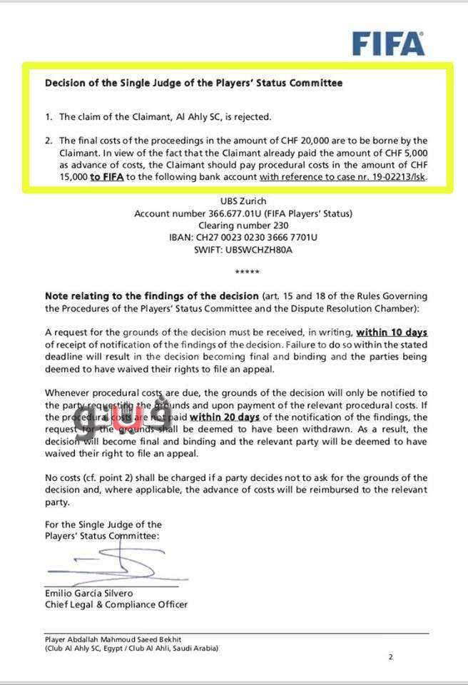 وهذا ما أقره الاتحاد الدولي لكرة القدم في 17 أبريل من عام 2020، وإلزام النادي الأهلي المصري بكل المصروفات، والمقدرة حينها بقيمة 15 ألف فرانك سويسري، وهذا حكاما نهائيا غير قابل للاستئناف، أو الطعن، أو تقديم شكوى في أي جهة أخرى.