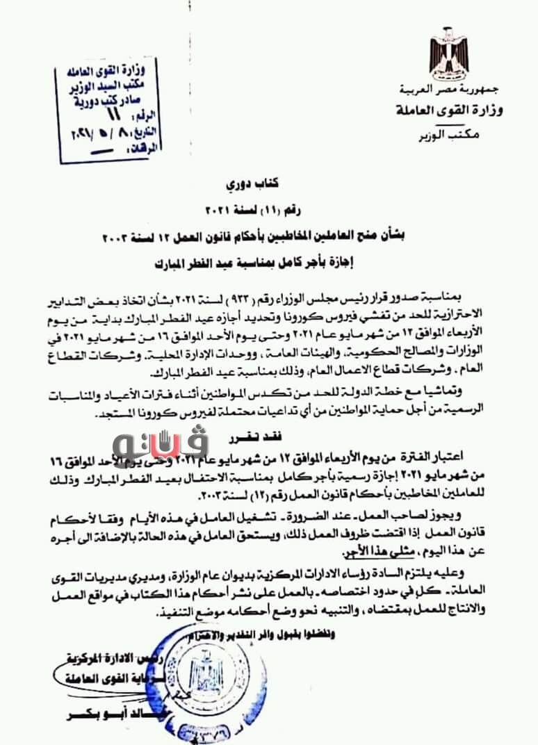 يذكر أن رئيس مجلس الوزراء أصدر قرارا بشأن اتخاذ بعض التدابير الاحترازية للحد من تفشي فيروس كورونا، تحديد إجازة عيد الفطر المبارك بداية من يوم 12 إلي 16 مايو الجاري في الوزارات والمصالح الحكومية والهيئات العامة ووحدات الإدارة المحلية وشركات القطاع العام ، وشركات قطاع الأعمال العام.