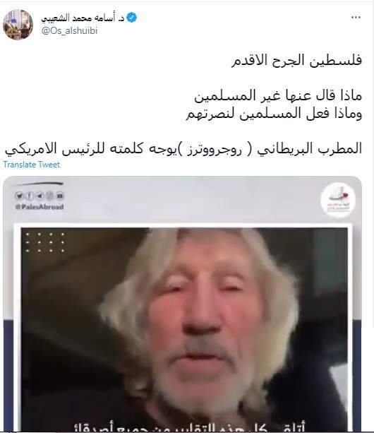 بث السفير السعودي السابق لدى اندونيسيا الدكتور أسامة محمد الشعيبي مقطع فيديو مؤثر للمغني البريطاني روجر ووترز، الذي أعلن تضامنه من الشعب الفلسطيني في مقاومته لمنع المستوطنين من الاستيلاء على منازلهم وأراضيهم بالقوة في حي الشيخ جراج.