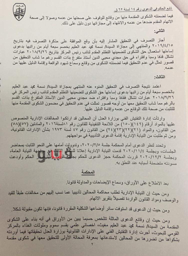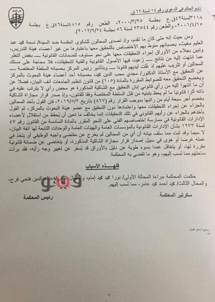أصدرت المحكمة التأديبية العليا بمجلس الدولة حكمها في القضية رقم 14 لسنة 62 قضائية عليا ببراءة مدير عام الإدارة القانونية بالمركز القومي للبحوث ومدير التحقيقات وإحدى المحاميات بالمركز بعد ثبوت عدم ارتكابهم مخالفات إدارية وقانونية.