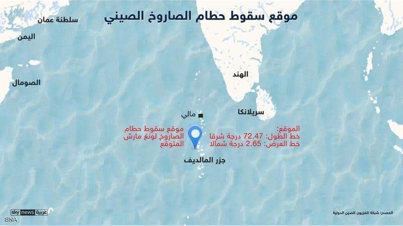 ووفقا للإحداثيات، التي نشرتها وسائل الإعلام الصينية الرسمية نقلا عن مكتب هندسة الفضاء الصيني، يبدو موقع سقوط الحطام قرب إحدى جزر أرخبيل المالديف وإلى الجنوب الغربي من العاصمة مالي.
