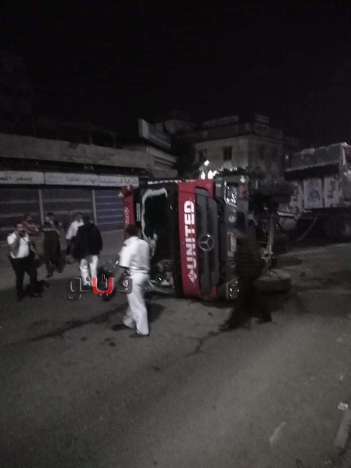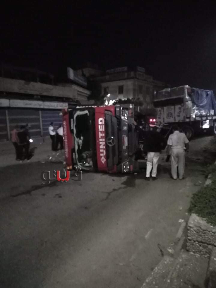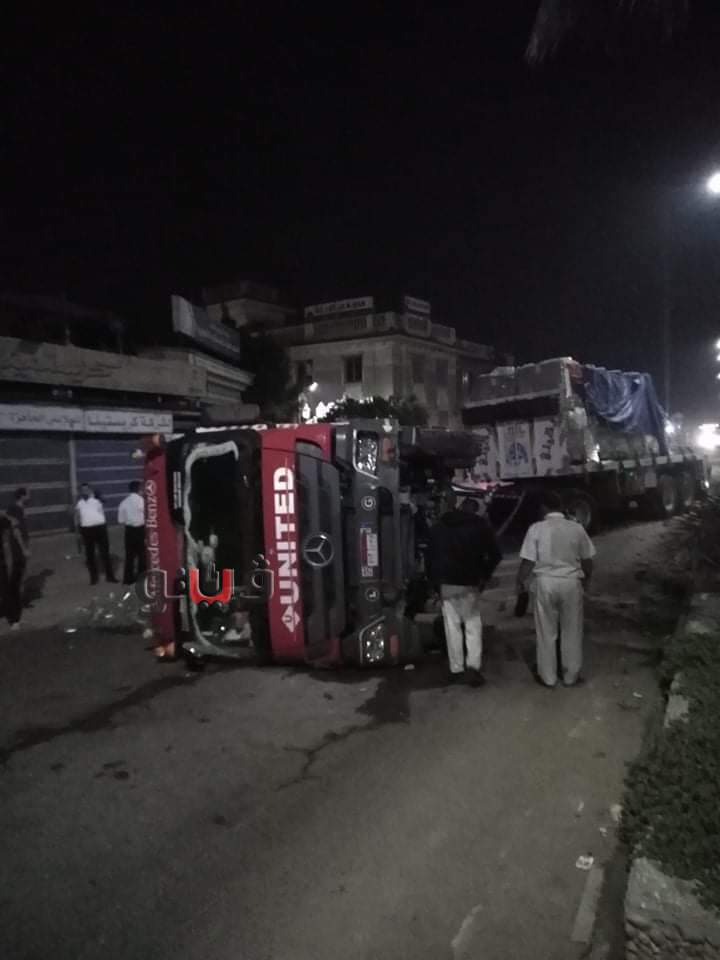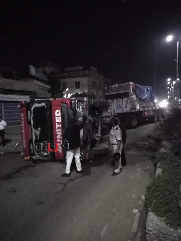 انقلاب سيارة "تريلا" تحمل شحنة زجاجات طبية بطريق المحلة - طنطا | صور