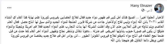 وأضاف "الناظر" خلال منشور كتبه على حسابه على موقع التواصل الاجتماعي "فيس بوك": "الأخبار جاءت من شركة فايزر المنتجة للدواء الجديد والتي سبق لها إنتاج مصل فعال العام الماضي، ويتم تناوله من قبل الملايين حتى الآن، وقد أعلنت الشركة أنها بدأت التجارب على الدواء الجديد فعلًا في أمريكا وبلجيكا".