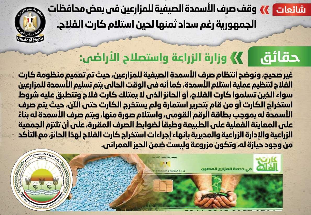 انتشر في بعض المواقع الإلكترونية وصفحات التواصل الاجتماعي أنباء حول وقف صرف الأسمدة الصيفية للمزارعين في بعض محافظات الجمهورية رغم سداد ثمنها لحين استلام كارت الفلاح.