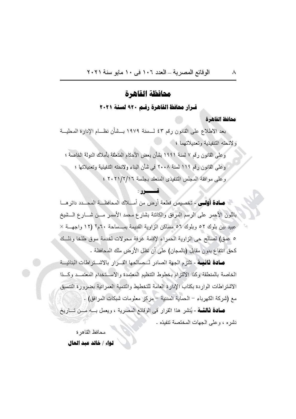 نشرت جريدة الوقائع المصرية في عددها رقم 106، الصادر في 10 مايو 2021، قرار محافظة القاهرة رقم 920 لسنة 2021، بشأن تخصيص قطعة أرض من أملاك المحافظة بشارع محمد الأسمر من شارع الشيخ عبيد بين بلوك 52 وبلوك 56 مساكن الزاوية القديمة، لصالح حى الزاوية الحمراء، لإقامة غرفة محولات لخدمة سوق طلخا، كحق انتفاع بدون مقابل (بالمجان).