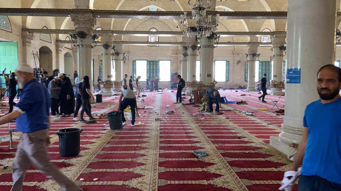 خلفت العشرات من الجرحى الفلسطينيين، شرع المعتكفون داخل المسجد الأقصى في تنظيف ساحات المسجد لاستكمال شعائرهم.