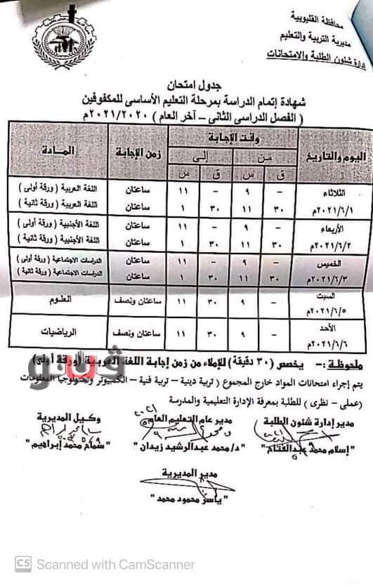 واعتمد عبدالحميد الهجان محافظ القليوبية، جدول الامتحانات للفصل الدراسي الثاني لعام 2020 /2021، لشهادة إتمام الدراسة بمرحلة التعليم الأساسي "الشهادة الإعدادية".